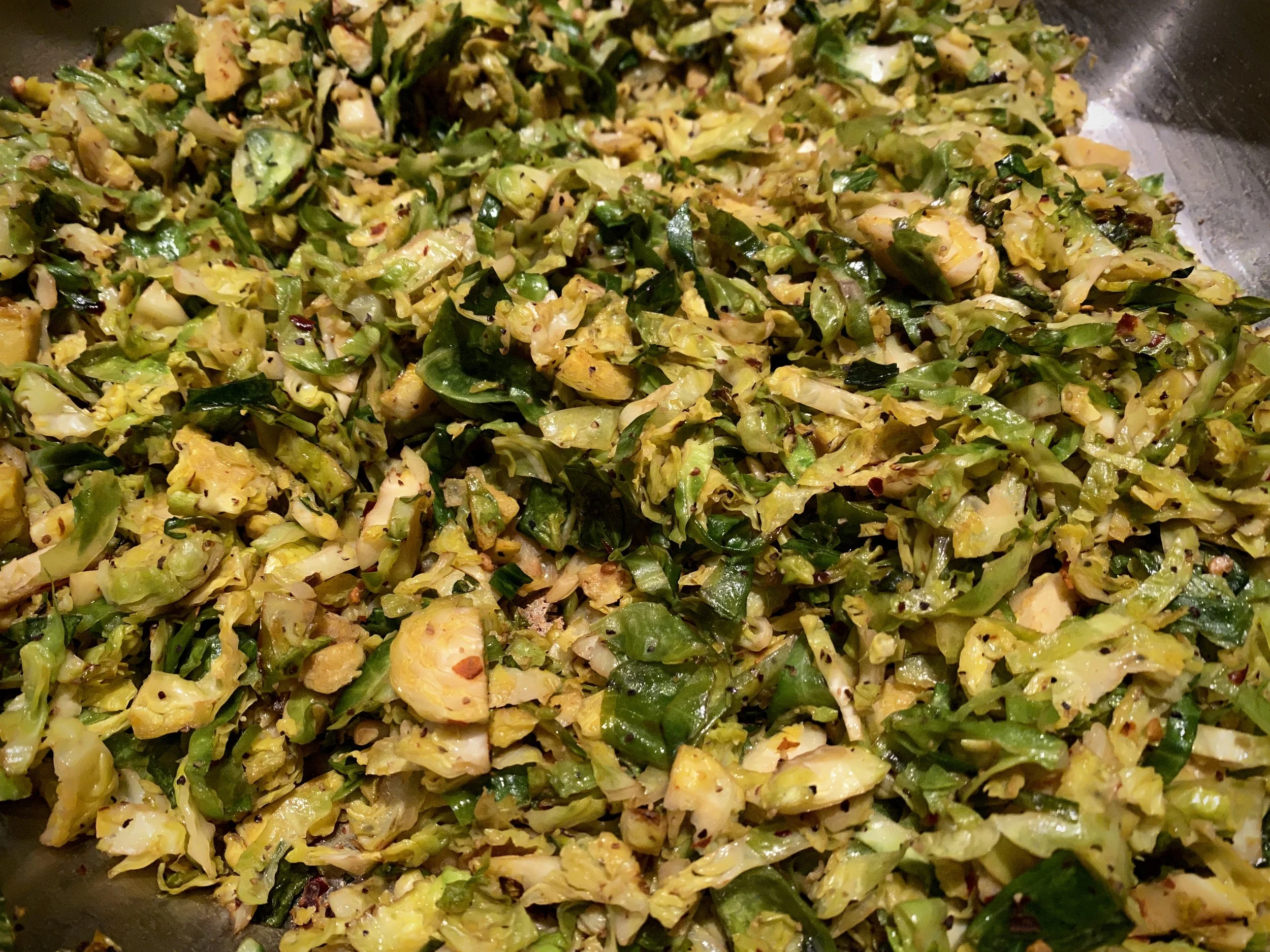 Sautéed Brussels Sprouts trim off the stem, halve, and thinly slice the sprouts. Sauté in olive oil with red pepper flake, S & P until soft and begin to brown. Adding white wine or broth as needed if the sprouts begin to stick and burn. Bonus move, stir in crispy bacon or pancetta pieces just before serving.